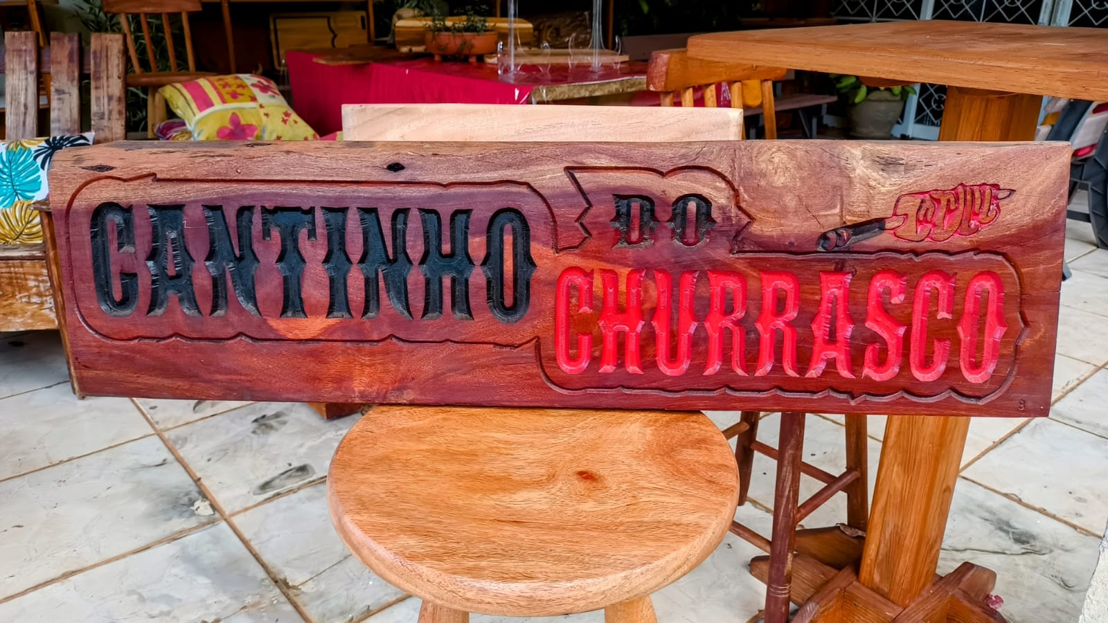 Plaquinha decorativa - CANTINHO DO CHURRASCO - Em madeira angico preto. com 90 x 24 cm e 2 cm de grossura. Letras esculpidas na madeira e pintada a mão.