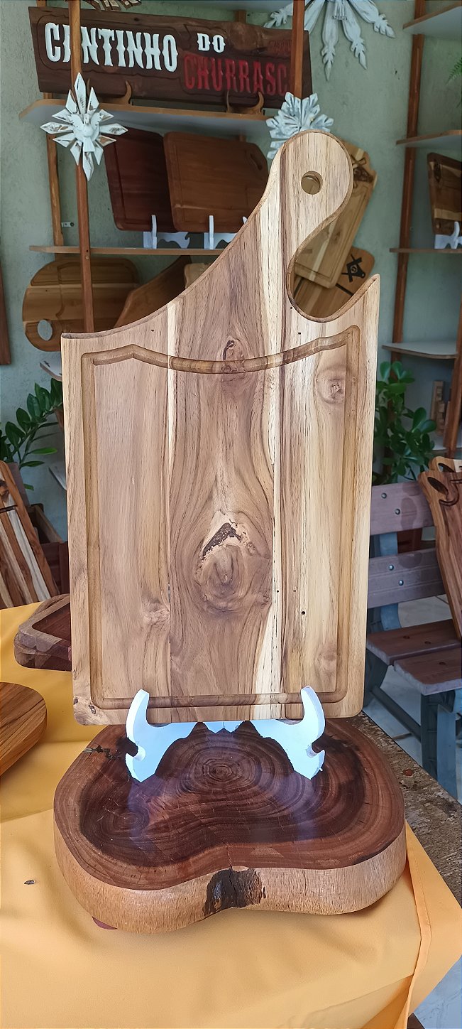 Utilize para cortar carnes, legumes e outros alimentos durante o preparo de churrascos ou refeições. Após o uso, limpe com pano úmido e evite imersão prolongada em água para preservar a madeira. Ideal para servir e decorar a mesa em eventos familiares ou entre amigos.